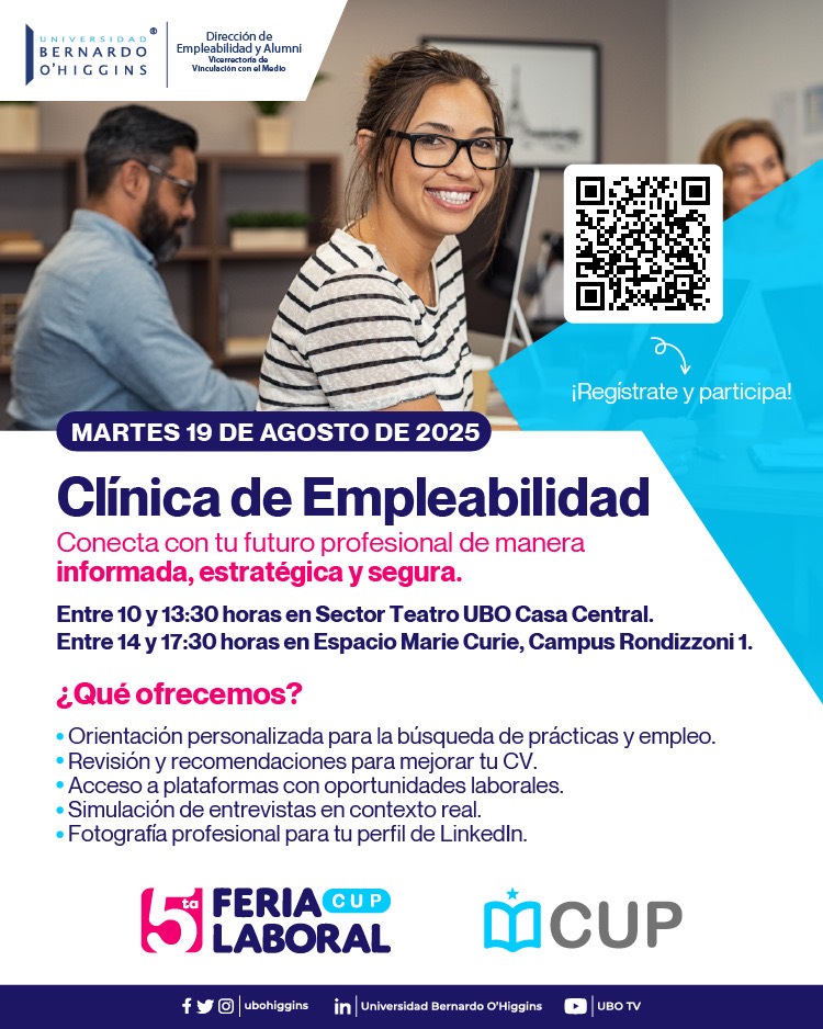 Alumni UBO te invita a que no pierdas esta oportunidad de proyectar tu carrera con herramientas concretas. Inscríbete y accede a: orientación personalizada con expertos de Trabajando.com, mejora tu CV, simula entrevistas laborales, actualiza tu foto para LinkedIn ¡y mucho más! en la Universidad Bernardo O’Higgins.
