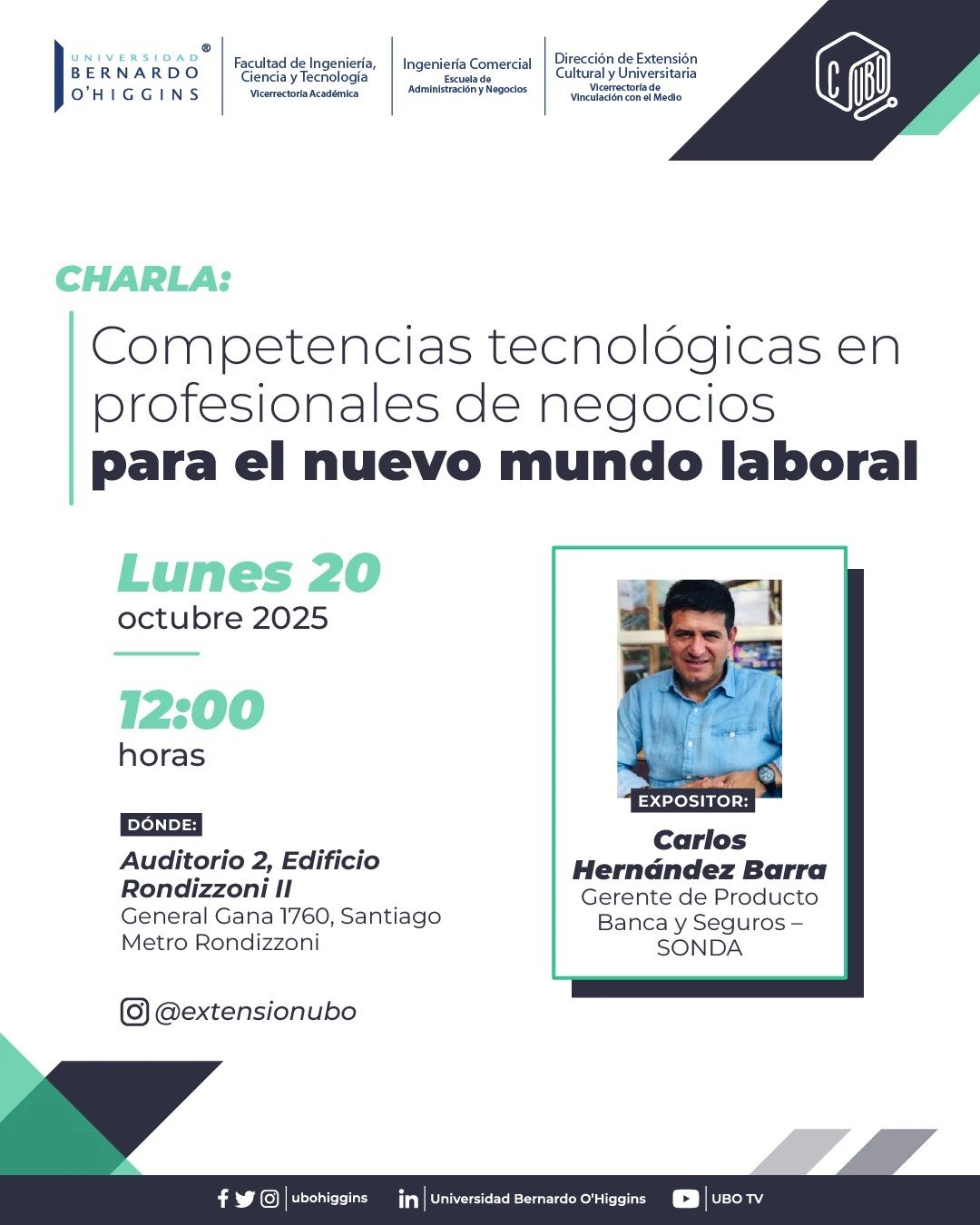 La Facultad de Ingeniería, Ciencia y Tecnología, a través de la Escuela de Ingeniería Comercial y la Dirección de Extensión Cultural y Universitaria de la Universidad Bernardo O’Higgins, invitan a participar en la charla “Competencias tecnológicas en profesionales de negocios para el nuevo mundo laboral”.