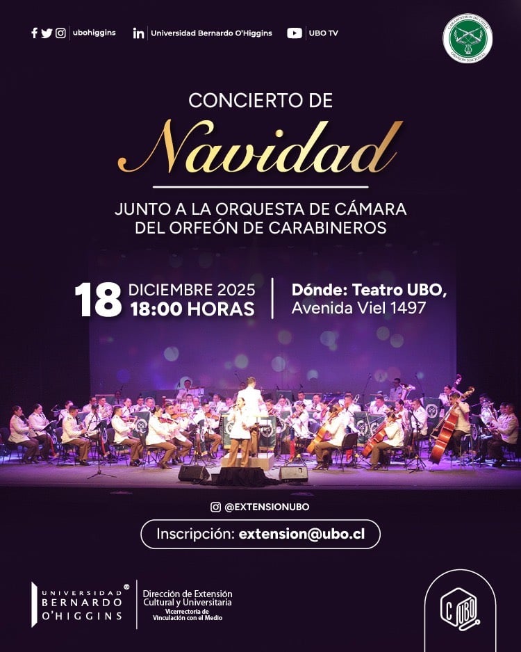 La Universidad Bernardo O’Higgins invita a toda la comunidad universitaria y al público general a disfrutar de un Concierto de Navidad único, a cargo de la destacada Orquesta de Cámara del Orfeón Nacional de Carabineros de Chile.
