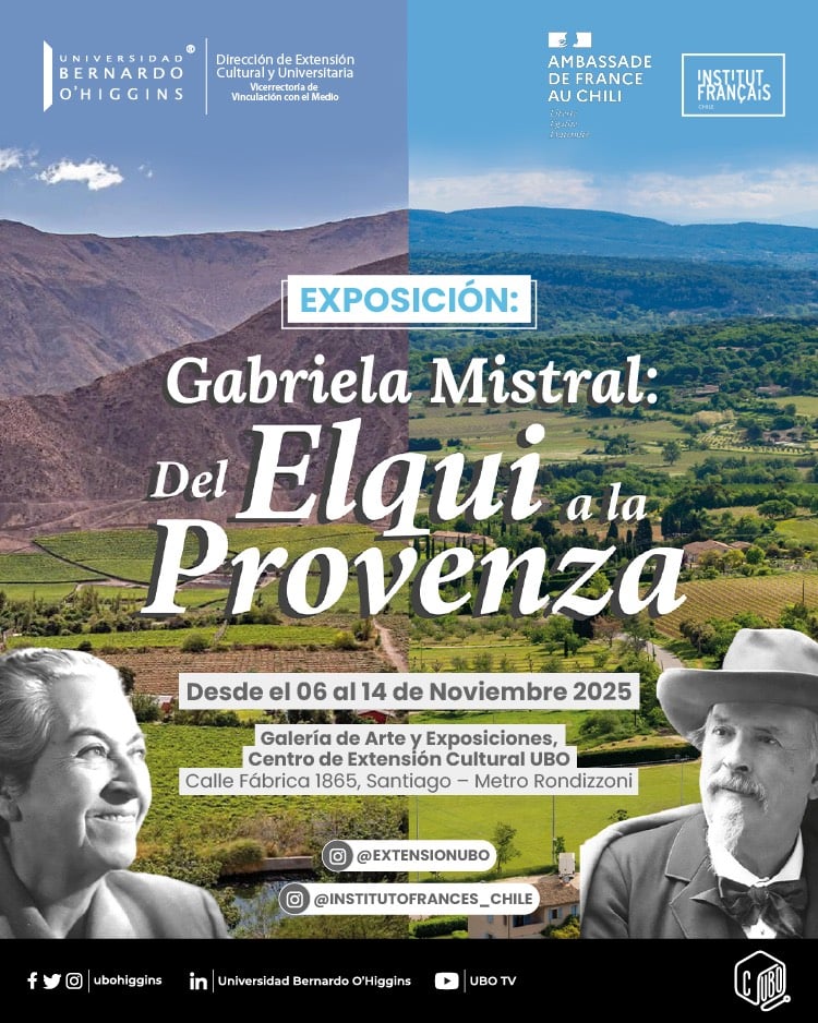 La Dirección de Extensión Cultural y Universitaria de la Universidad Bernardo O’Higgins, en colaboración con la Embajada de Francia en Chile y el Instituto Francés de Chile, invita a toda la comunidad a visitar la exposición “Gabriela Mistral: Del Elqui a la Provenza”, una muestra que recorre el vínculo cultural entre Chile y Francia a través de la figura de nuestra destacada poeta y Premio Nobel de Literatura.