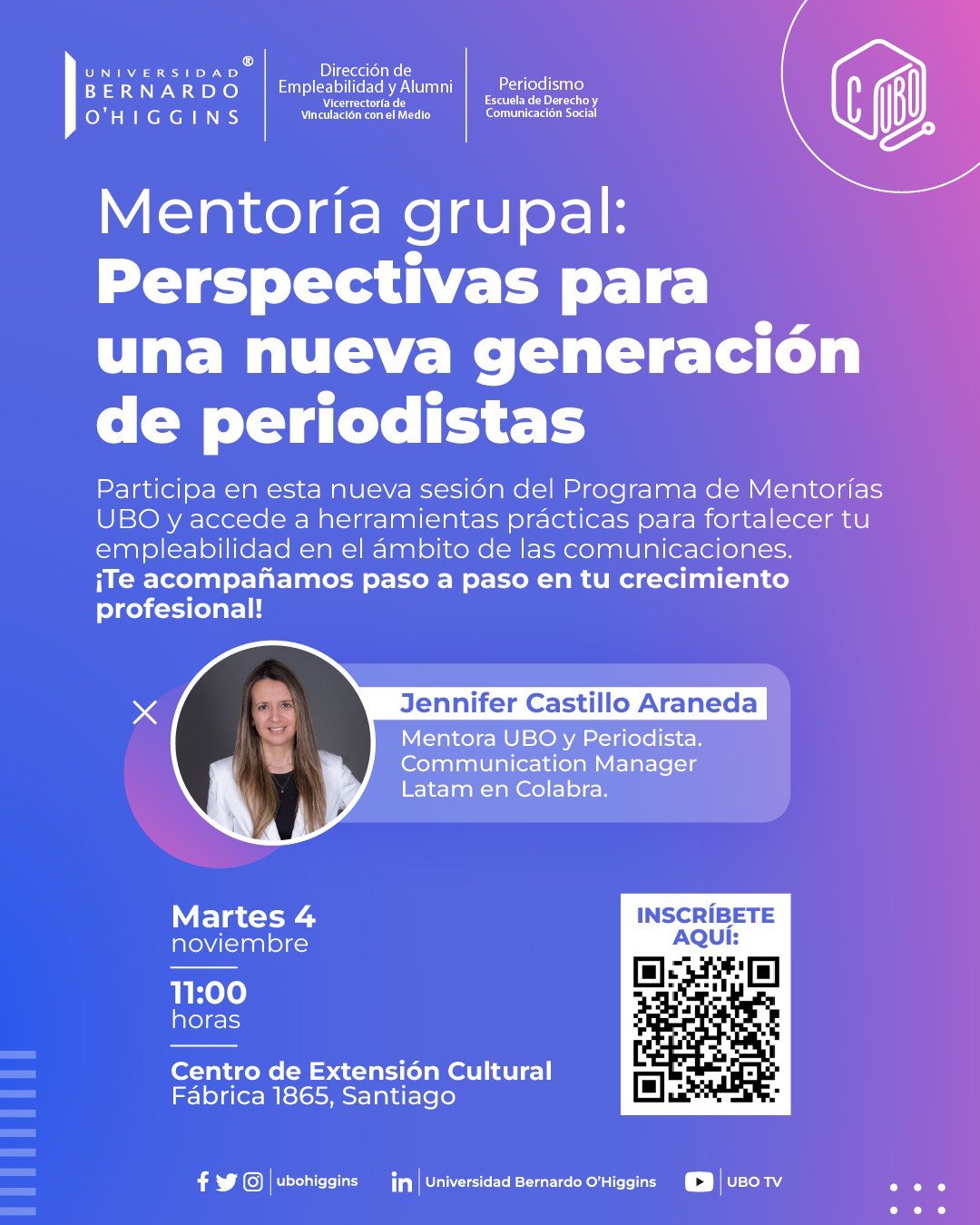 Participa en esta nueva sesión del Programa de Mentorías UBO y accede a herramientas prácticas para fortalecer tu empleabilidad en el ámbito de las comunicaciones.