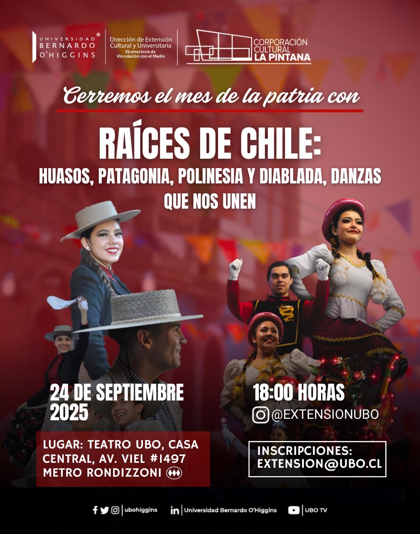La Universidad Bernardo O’Higgins, a través de la Dirección de Extensión Cultural y Universitaria, junto a la Corporación Cultural de La Pintana, te invita a vivir un espectáculo que celebra lo mejor de nuestra identidad.