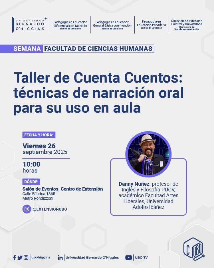 La actividad será dirigida por Danny Núñez, profesor de Inglés y Filosofía (PUCV) y académico de la Facultad de Artes Liberales de la Universidad Adolfo Ibáñez, reconocido por su experiencia en el arte de contar historias.